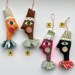 A jolly fellow to hang on your tree, or keep up all year round for that matter! He is a dapper chap in his fez and circus ruff. Quite a good size (and quite fiddly to make), approx. 25cm long including the hanging twine. The reverse is unbleached calico.