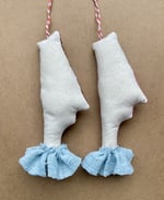 A jolly fellow to hang on your tree, or keep up all year round for that matter! He is a dapper chap in his fez and circus ruff. Quite a good size (and quite fiddly to make), approx. 25cm long including the hanging twine. The reverse is unbleached calico.