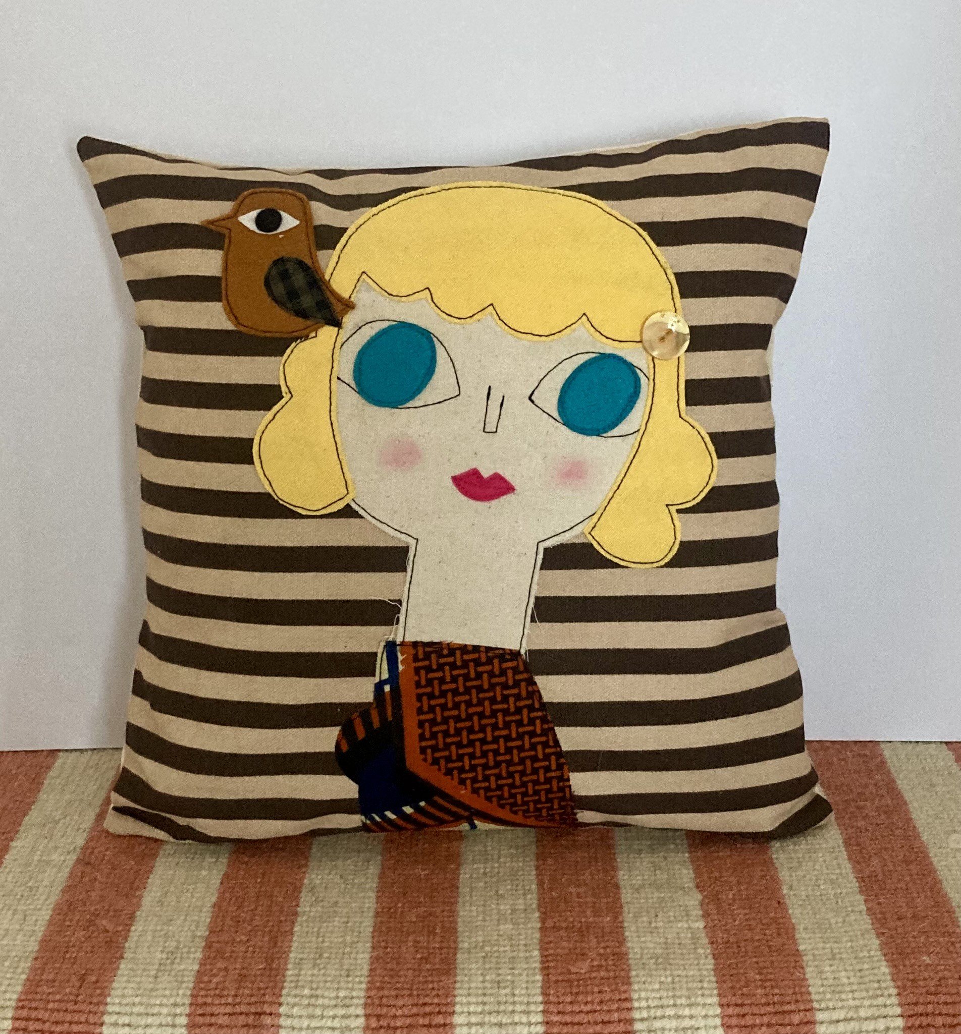A cute sized cushion, of a cute Dolly Girl. This big-eyed doll cushion has a retro feel and would make a jolly addition to your sofa, chair, bed. Made from vintage and reclaimed cotton fabrics. Spot clean your cushion with a mild detergent, please do not put her in the washing machine!